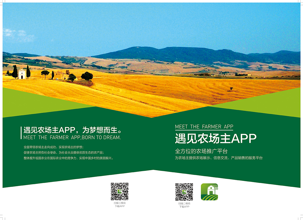 全方位的農場(chǎng)推廣平臺, 遇見(jiàn)農場(chǎng)主APP:為農場(chǎng)主提供農場(chǎng)展示、信息交流、產(chǎn)品銷(xiāo)售的服務(wù)平臺。 遇見(jiàn)農場(chǎng)APP宣傳畫(huà)冊,武漢朗迅文化傳播有限公司,對畫(huà)冊設計、畫(huà)冊印刷 對畫(huà)冊